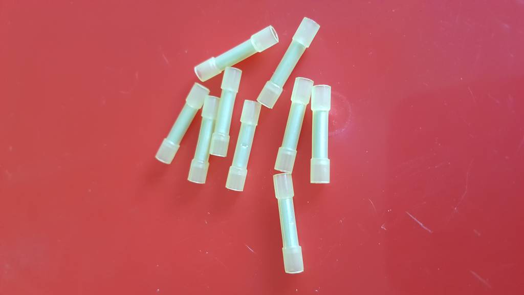 Stoßverbinder mit Schrumpfschlauch, für eine feste und saubere Verbindung. Metallrohrleuchte in Quetsch- und Schrumpfschlauch mit Schrumpfschlauch.